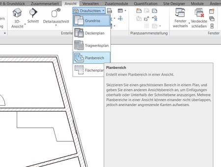 Man öffnet den Grundriss, wählt im Menu 'Ansicht' das Feld 'Draufsichten' und wartet bis sich das Menufeld öffnet und klickt auf das Feld 'Planbereich'.