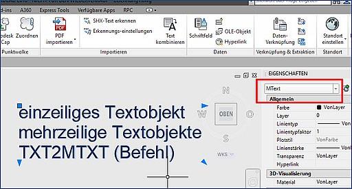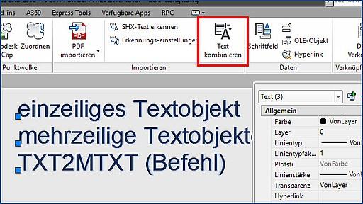 Mit dem Werkzeug „Text kombinieren“ können Sie einzelne Textobjekte in einen mehrzeiligen Text umwandeln. Außer einzeiligen Text können auch MText-Objekte kombiniert werden.