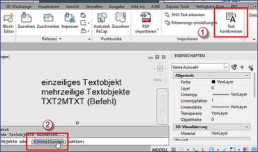 Über die Multifunktionsleisten-Registerkarte „Einfügen“ können Sie auf das Werkzeug „Text kombinieren“ (Befehl: TXT2MTXT) aufrufen. Über eine Option in der Befehlszeile kann das Dialogfeld „Text kombinieren“ Einstellungen angezeigt werden.
