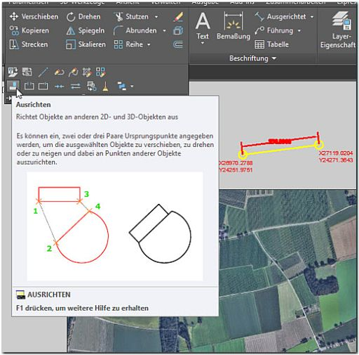 eingefügt werden. Zusätzlich muss das Bild richtig skaliert und gedreht werden. Diese Aufgabe kann man in AutoCAD sehr einfach lösen. Sie benötigen nur 2 Koordinaten-Punkte, mit deren Hilfe Sie das Luftbild
