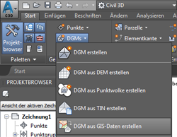 DGM erstellen Anschließend starten Sie in der Multifunktionsleiste Start in der Gruppe Geländedaten erstellen im Flyout DGMs den Befehl DGM aus GIS-Daten erstellen. Parametrisieren Sie die Eigenschaften der Oberfläche und klicken Sie auf Weiter.
