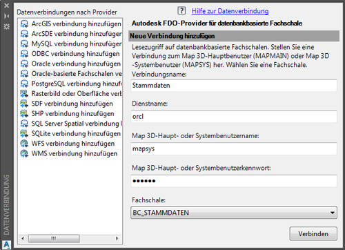 Variante A: Export der relevanten Geometrien in eine ESRI-Shape Datenbankverbindung zur Fachschale herstellen Öffnen Sie das AutoCAD Map-Aufgabenfenster. Starten Sie dazu ggf. den Befehl MAPWSPACE und starten die Option Ja. Stellen Sie in der Datenverbindungstabelle eine Verbindung zu Ihrer Fachschale her. Verwenden Sie die MAPSYS-Berechtigungen, die Sie auch in AutoCAD Map verwenden.