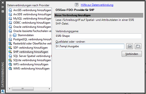 ESRI-Shape Verbindung herstellen Stellen Sie nun noch eine neue Shape-Verbindung zu einem leeren Ordner her.