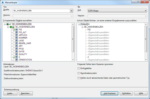 Wählen Sie auf der rechten Seite die Datenverbindung der Shape-Datei aus. Auf der linken Seite wählen Sie hingegen den Layer mit den gefilterten Punkten aus und aktivieren Sie darunter die Objektklasse sowie die Felder, die für den Export relevant sind, z.B. FID, GEOM und Z. Achten Sie darauf, dass ESRI Shape keine Sonderzeichen und keine Bezeichnungen mit mehr als 11 Zeichen zulässt. Ändern Sie ggf. die Feldbezeichnungen auf der rechten Seite entsprechend. Klicken Sie auf die Schaltfläche Jetzt kopieren, um den Vorgang zu starten.