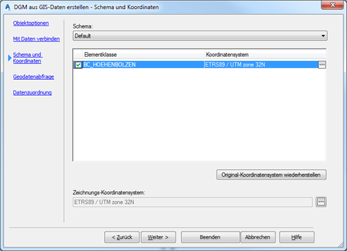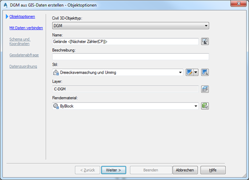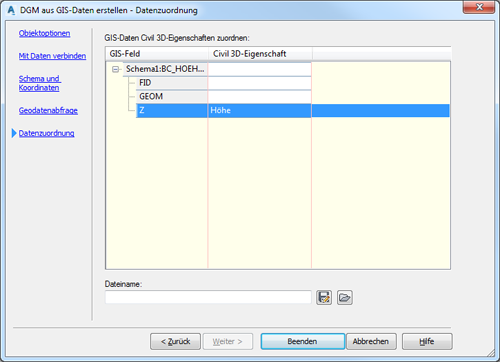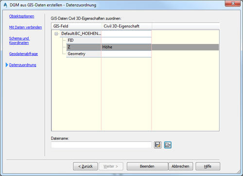 Weisen Sie zum Schluss einem Datenfeld die Civil-3D-Eigenschaft Höhe zu und klicken auf Beenden. Das DGM wird aus den Geodaten erstellt.