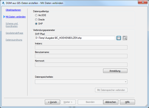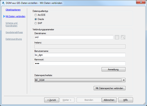 Grundsätzlich haben Sie nun drei Möglichkeiten, die Daten Ihrer Oracle-basierten Fachschale als Datenquelle für das Geländemodell zu nutzen.