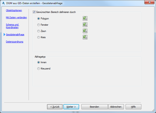 Bestimmen Sie den gewünschten Bereich, indem Sie ein Polygon, Fenster, Zaun oder Kreis definieren oder aber deaktivieren Sie den Zustandsschalter Gewünschten Bereich definieren nach, wenn Sie alle Daten einbeziehen möchten. Klicken Sie noch einmal auf Weiter.