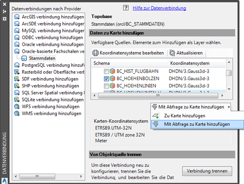 Nach dem Klicken auf die Schaltfläche Verbinden aktivieren Sie die gewünschte Objektklasse aus der Liste der verfügbaren Objektklassen. Erweitern Sie die Flyout-Schaltfläche Zu Karte hinzufügen und starten den Befehl Mit Abfrage zu Karte hinzufügen.