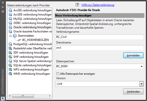 Wer schon einmal versucht hat, in AutoCAD Civil 3D ein Geländemodell aus den Daten einer Oracle-Datenbank zu erstellen, dem wird aufgefallen sein, dass nur - wenn überhaupt - bestimmte Oracle-User aufgelistet werden. Der Grund hierfür liegt in der zugrundeliegenden Datenzugriffstechnologie: AutoCAD Civil 3D verwendet nämlich für den Zugriff auf die Datenbank den FDO-Provider für Oracle, der ganz bestimmte Metadatentabellen erwartet als die Oracle-basierten Fachschalen von AutoCAD Map.