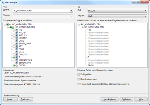 Wählen Sie auf der rechten Seite die Datenverbindung des Oracle-Datenspeichers aus. Auf der linken Seite wählen Sie hingegen den Layer mit den gefilterten Punkten aus und aktivieren Sie darunter die Objektklasse sowie die Felder, die für den Export relevant sind, z.B. FID, GEOM und Z. Klicken Sie auf die Schaltfläche Jetzt kopieren, um das Schema anzulegen und die Objekte zu kopieren.