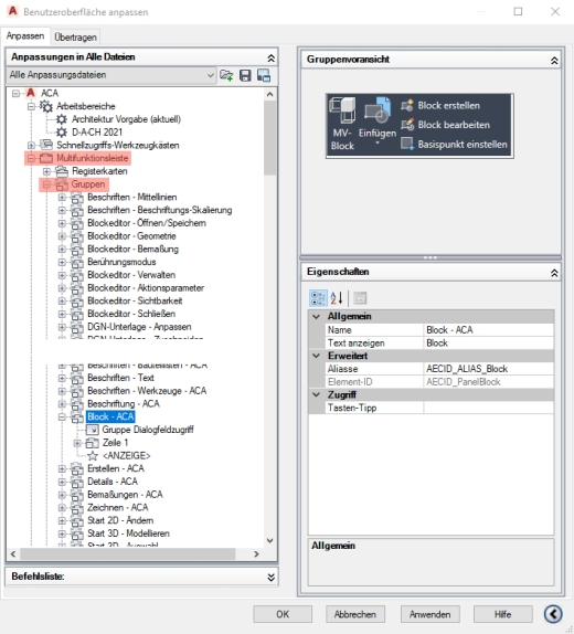 1. Den Dialog "Benutzeroberfläche anpassen" aufrufen. Entweder mit Befehlszeileneingabe "cui" (funktioniert nur bei deaktivierter Autokorrektur) oder über Menüleiste "Verwalten" > "Benutzeranpassung" > Benutzeroberfläche". Dort in der Hauptanpassungsdatei unter "Multifunktionsleiste" die Gruppe "Block - ACA" heraussuchen.