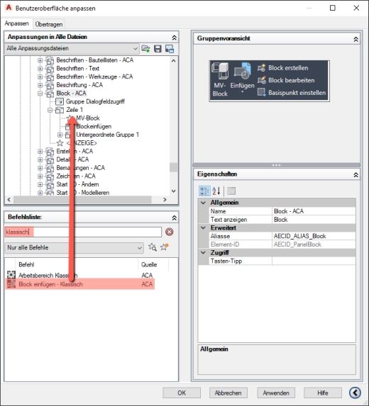 2. Den Befehl "Block einfügen - Klassisch" mittels Suchfunktion in der Befehlsliste suchen. Dann den Befehl per Drag&Drop in die Zeile 1 der Munltifunktionsleisten-Gruppe "Block - ACA" ziehen.