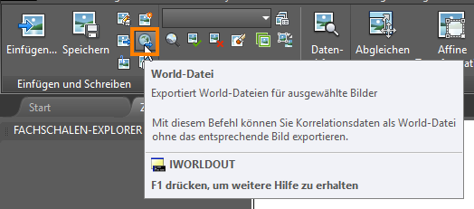 Nachdem die Bilddatei korrekt transformiert wurde, kann über die Funktion „World-Datei“ im Register „Rasterwerkzeuge“ in der Gruppe „Einfügen und Schreiben“ einfach die Georeferenzierung zum Bild abgespeichert werden.