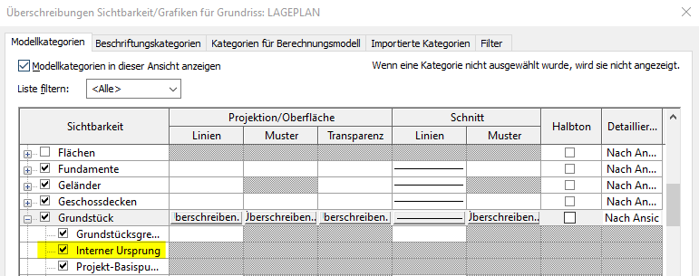 Ab Revit 2020.2 kann der interne Ursprung über die Sichtbarkeitseinstellungen auch angezeigt werden.