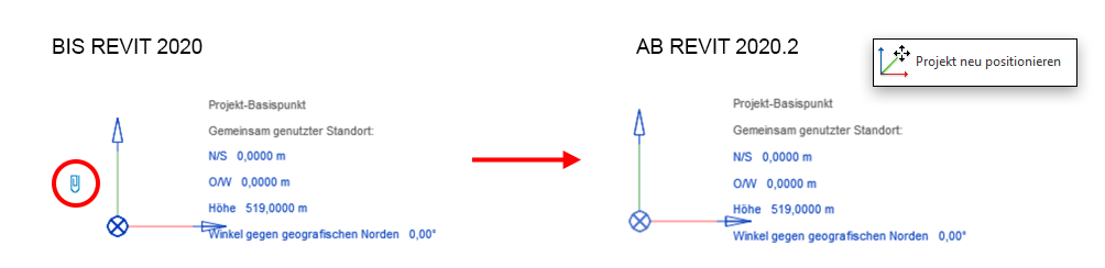 Eine weitere Neuerung von Revit 2020.2, die in diesem Zusammenhang eine Rolle spielt: Die Büroklammer, welche den Projektbasispunkt fixiert, wurde entfernt. Die Funktionalität eines fixierten Projektbasispunktes steht aber weiterhin über die Funktion „Projekt neu positionieren“ in der Registerkarte „Verwalten“ unter „Position“ zur Verfügung.