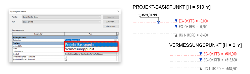 Zusätzlich ist es wichtig zu wissen, dass Ebenenhöhen lediglich in Abhängigkeit vom Projektbasispunkt oder Vermessungspunkt angezeigt werden können. Nachfolgend wird von der durch Revit voreingestellten Variante – Ebenen Basishöhe abhängig vom Projekt-Basispunkt – ausgegangen.