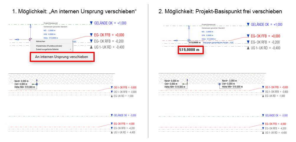 Da man den internen Ursprung nicht frei verschieben kann, wird zunächst der Projekt-Basispunkt auf die Höhe des internen Ursprungs verschoben. Dazu stehen in Revit zwei Funktionen zur Verfügung:
