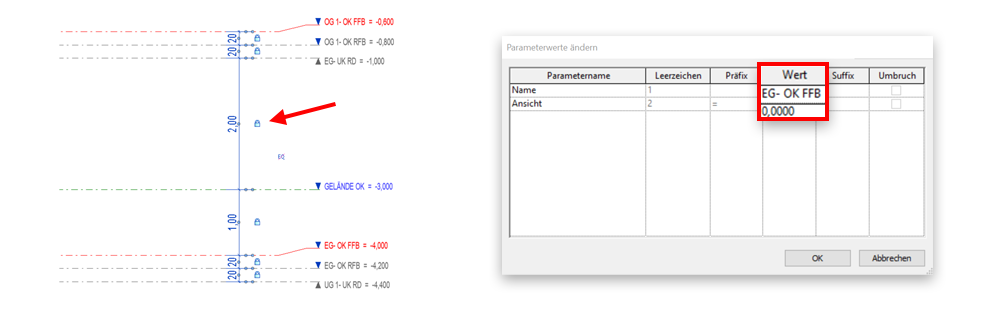 Um alle Ebenen auf einmal und mit dem im Vorfeld definierten Abstand zu verschieben, ist es am einfachsten, eine ausgerichtete Bemaßung zwischen allen Ebenen zu erstellen und diese mit den Schlössern zu sperren. Anschließend kann der Höhenwert der Ebene EG OK FFB auf 0 umgestellt werden.