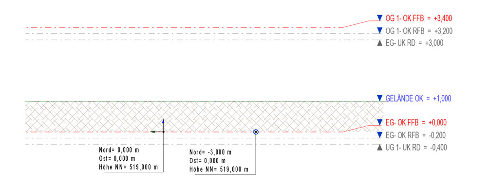 Der Projekt-Basispunkt und der interne Ursprung liegen nun wieder auf der gleichen Höhe. Da der Projekt-Basispunkt als Bezugshöhe für die Ebenen angegeben wurde, haben sich durch den vorherigen Schritt allerdings auch die Werte der Ebenenhöhen geändert. Die Ebene EG OK FFB, welche als Nullebene definiert wurde, liegt jetzt bei -4 m. Dementsprechend müssen die Ebenen auf die richtige Höhe verschoben werden.