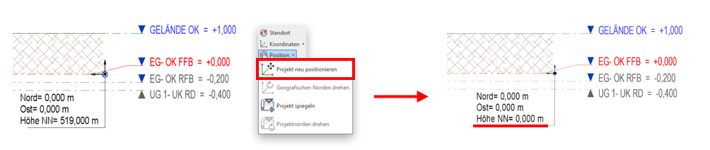 Wie bereits erwähnt, lässt sich der interne Ursprung nicht frei positionieren. Deshalb ist es zunächst notwendig das ganze Projekt mit dem Werkzeug „Projekt neu positionieren“ oder „Koordinaten an Punkt angeben“ auf die gewünschte Höhe (hier 0m) zu verschieben.