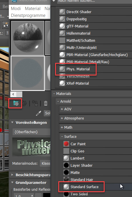 Definieren Sie ein neues Material und wählen als Standard ein „Phys. Material“ oder „Standard Surface“ aus.