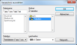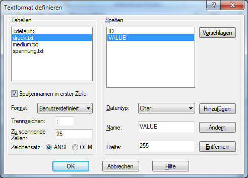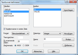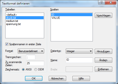 Klicken Sie auf die Schaltfläche Format definieren, können Sie im untergeordneten Dialog für jede Textdatei die Felddefinition konfigurieren. In der linken Liste erscheinen die Dateien, die bereits sich bereits in dem Ordner befinden. Außerdem ein Eintrag <default>, der als Vorgabe für alle weiteren, z.B. neueren Dateien steht. Für jede Datei können Sie Parameter bestimmen, die die Struktur der Tabelle beschreiben. Dabei gehen Sie für Semikolon-getrennte Feldwerte mit Spaltennamen in der ersten Zeile wie folgt vor: