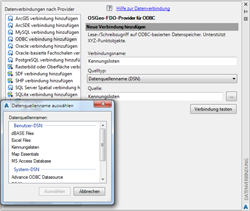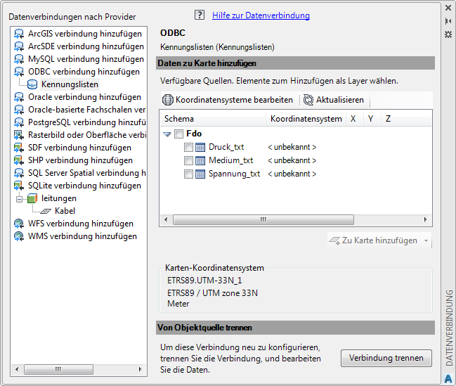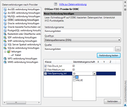 Im AutoCAD Map stellen Sie wie gewohnt die ODBC-Verbindung her, indem Sie in der Datenverbindungspalette den Provider ODBC markieren, einen Verbindungsnamen wählen und auf die Schaltfläche Verbindung testen klicken. Es erscheinen die konfigurierten Textdateien. Weisen Sie in der Spalte Identitätseigenschaft jeweils das Schlüsselfeld zu. Klicken Sie zum Abschluss auf Verbinden.