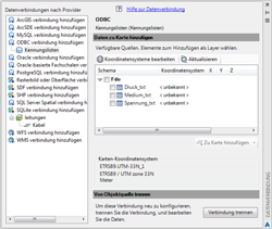 Würde es sich bei den Textdateien um Punktobjektklassen handeln, könnten Sie nun einzelne Tabellen markieren und Felder für Hoch- und Rechtswerte auswählen. Die geometrien würden dann beim Klick auf Zu Karte hinzufügen in der Zeichnung erscheinen.