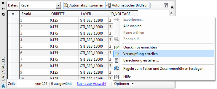 In diesem Fall ist das nicht erforderlich, denn Kennungslistenwerte werden ausschließlich durch Verküpfung verwendet. Markieren Sie dazu in der Darstellungsverwaltung von AutoCAD Map den Layer, den Sie mit einer ODBC-Tabelle verknüpfen wollen und klicken die rechte Maustaste. Starten Sie im Kontextmenü den Befehl Datentabelle anzeigen.