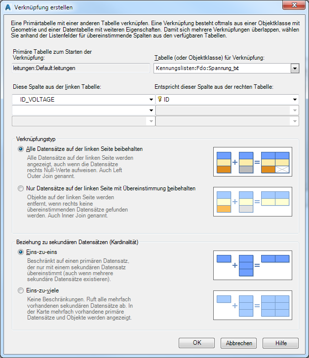 Es ist bereits das Feld der primären Tabelle gefüllt. Wählen Sie darunter das Feld aus, mit dem Sie die Kennungsliste verbinden wollen. Markieren Sie oben rechts die dazugehörige Kennungslistentabelle aus und bestimmen darunter das Schlüsselfeld. Behalten Sie den Verknüpfungstyp Alle Datensätze auf der linken Seite beibehalten sowie die Eins-zu-Eins-Beziehung bei.