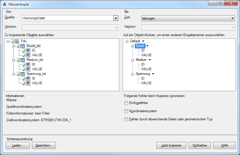 Sie können im Übrigen bei Bedarf die Tabellen aus den Textdateien auch in Geodatenbanken überführen. Nutzen Sie einfach aus dem AutoCAD Map-Arbeitsbereich in der Registerkarte Karten-Explorer hinter der Schaltfläche Extras die Massenkopie. Wählen Sie auf der linken Seite aus der ODBC-Datenverbindung die benötigten Kennungslisten aus und markieren auf der rechten Seite die Ziel-Verbindung. Bei Bedarf passen Sie noch die Namen von Tabellen und Feldern an und klicken zum Abschluss einfach nur auf OK. Schon werden die Tabellen mit ihren Werten übertragen. |