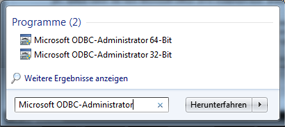 Öffnen Sie das Startmenü von Windows und geben Sie einfach ODBC ein, sofort werden Ihnen beide Verknüpfungen angezeigt.
