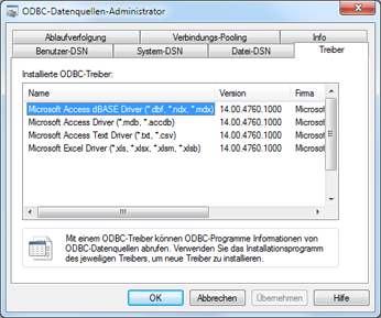 In diesem ODBC-Administrator können Sie jedoch nur Datenquellen einrichten, für die Sie entsprechende Datenbanktreiber installiert haben. Auf 32-Bit-Betriebssystemen verwenden Sie für Excel- und dBase-Tabellen und Access-Datenbanken den Microsoft JET-Treiber. |