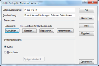 - Im nachfolgenden Dialog geben Sie der Datenquelle einen Namen und klicken die Schaltfläche Auswählen, um die zu verknüpfende Access-Datenbankdatei auszuwählen.