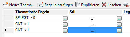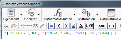 Nutzen Sie hingegen im Ausdrucksgenerator die IF-Bedingung, kommen Sie mit einer einzigen Stilregel aus, z.B. If ( 'BELEGT = 0', 'frei', If ( 'CNT=1', '1 Ziel', Concat ( CNT , ' Ziele') ) ) .