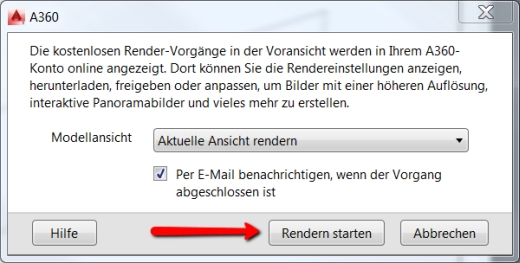 Über den Befehl "In der Cloud rendern" werden kostenlose Renderings der aktuellen oder aller Modellansichten erzeugt. Die gerenderten Bilder haben Standardqualität und eine Größe von 640 x 480 Pixeln.