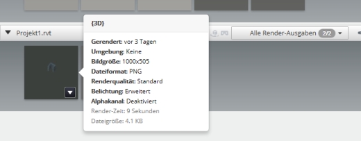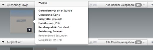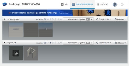 Über den Befehl "Render-Katalog" in der Multifunktionsleiste wird direkt auf das eigene A360-Konto zugeriffen. Hier werden die erzeugten Renderings verwaltet und es ist möglich sie erneut mit anderen Einstellungen, beispielsweise in in höherer Qualität, zu rendern.