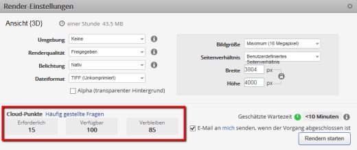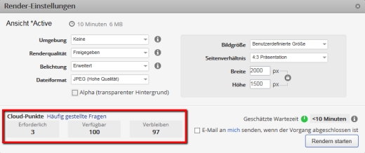 Die Kosten für ein Rendering in der Cloud werden abhängig von der Größe, der Qualität und der Art der Render-Ausgabe berechnet.
