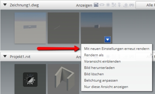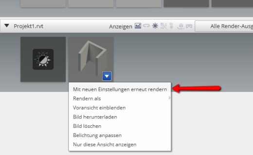 Jede Voransicht verfügt über eine Dropdown-Liste mit mehreren Menübefehlen. Der Befehl "Mit neuen Einstellungen erneut rendern" bietet die Möglichkeit ein erneutes Rendering mit anderen Parametern anzustoßen.