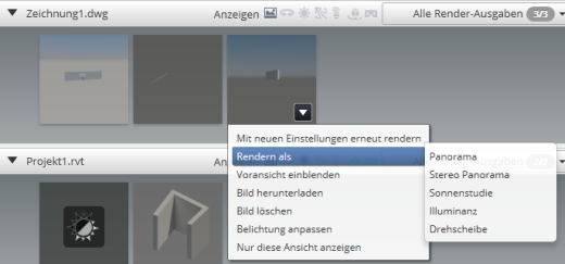 Der Befehl "Rendern als" in der Drop-Down-Liste der Voransicht stellt die zusätzlichen Rendermodi Sonnenstudien und animierte Rundumansichten zur Verfügung.