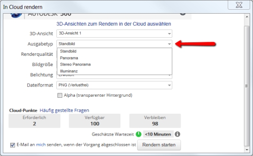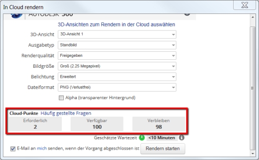 Der Befehl "In Cloud rendern" öffnet das gleichnamige Dialogfeld.