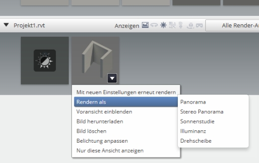 Ebenfalls in der Drop-Down-Liste findet sich der Befehl "Rendern als". Er wird verwendet, um Renderings in erweiterten Modi, beispielsweise Sonnenstudien und Illuminanzbilder zu erzeugen.